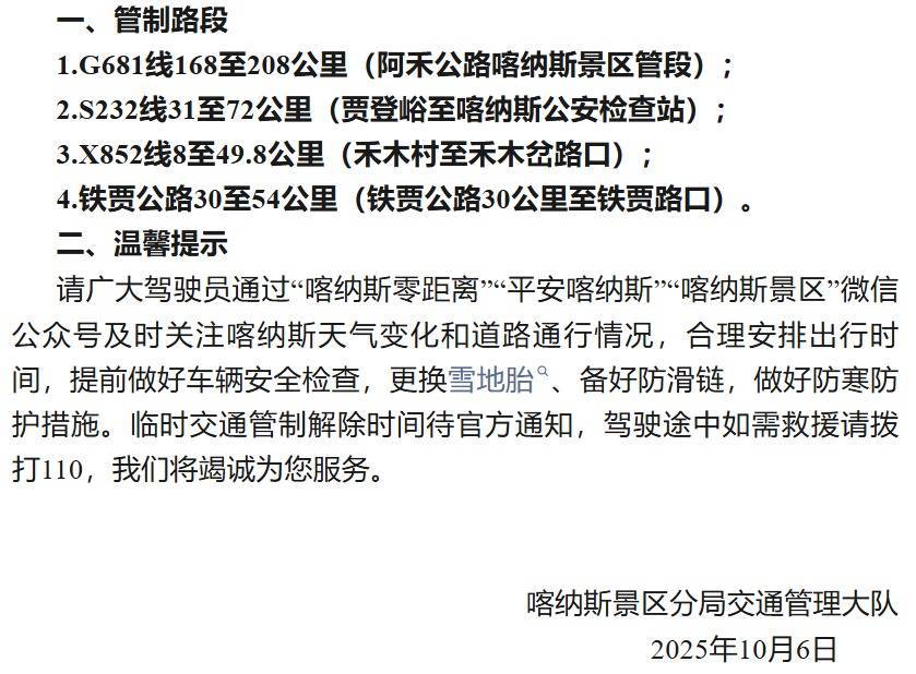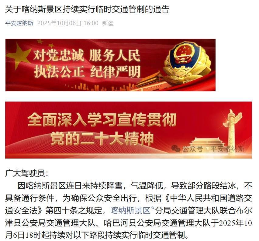 10月6日,喀纳斯景区分局交通管理大队发布关于喀纳斯景区持续实行临时交通管制的通告:因喀纳斯景区连日来持续降雪,气温降低金投策略,导致部分路段结冰,不具备通行条件,为确保公众安全出行,根据《中华人民共和国道路交通安全法》第四十条之规定,喀纳斯景区分局交通管理大队联合布尔津县公安局交通管理大队、哈巴河县公安局交通管理大队于2025年10月6日18时起持续对以下路段持续实行临时交通管制。
